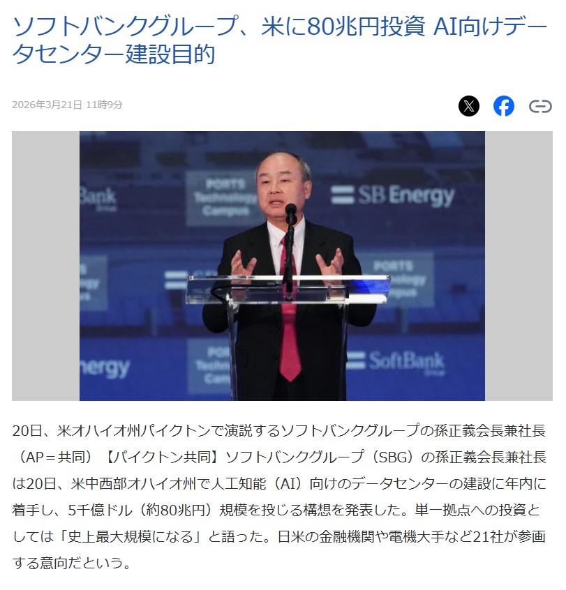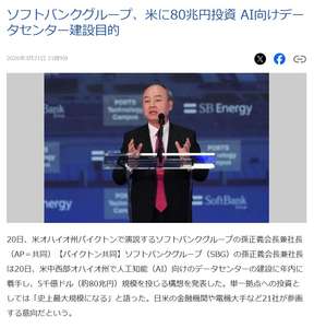 ソフトバンクグループ、米に80兆円投資 AI向けデータセンター建設目的