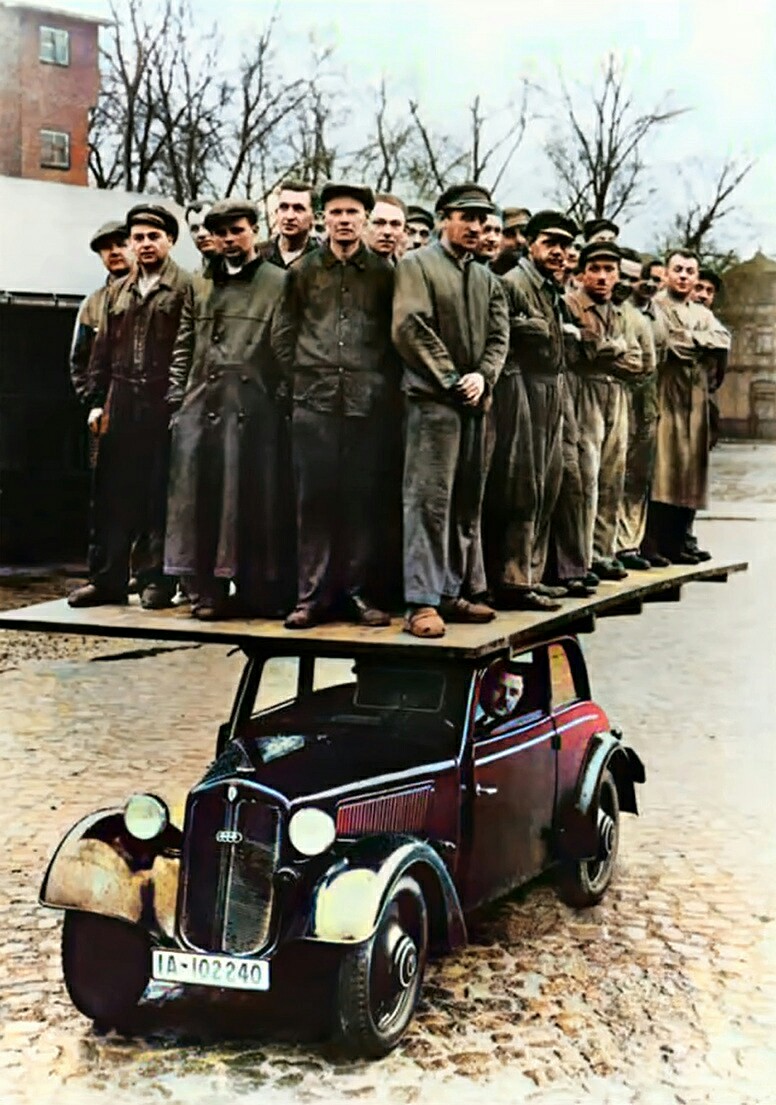 1937年。技術者たちがDKW F7の木製ボディの強度を実証している様子