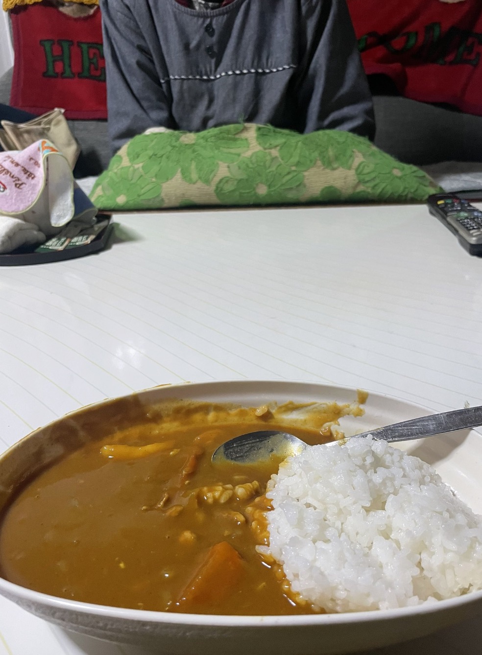 2杯目を食べるころには、ばあちゃんは起き上がりました。それからばあちゃんはテレビを見ているふりをしながら、ちらちらと孫の私がカレーを食べる様子を見ていました。