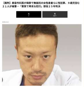 美容外科医が約9年にわたり、麻酔や睡眠薬で抵抗できない状態にした患者や看護師ら女性21人に性的暴行やわいせつ行為を繰り返した事件があり、東京地裁が先月、被告の男に懲役25年の実刑判決を言い渡したことがわかった。被害者のうち4人は当時未成年で9歳の女児もいた。