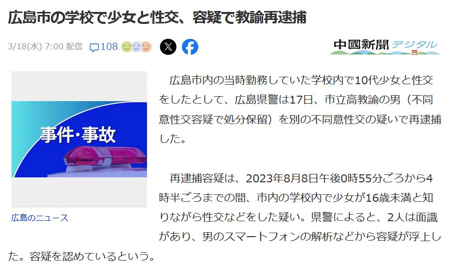 今日のニュースでわいせつ教師の免許再交付審議が大阪で初めてあって否決されたらしいけど