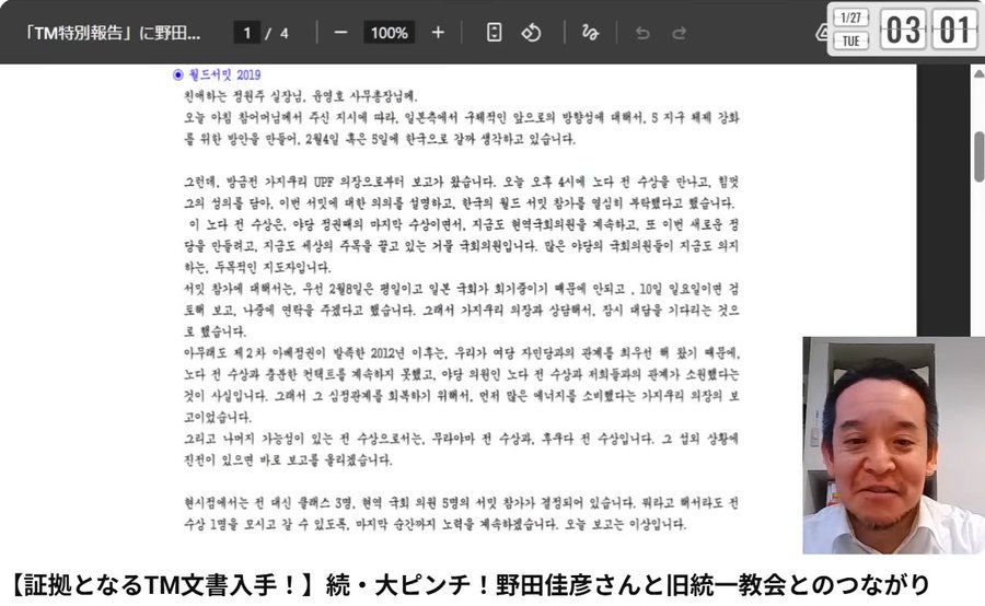 さらに、旧統一教会の徳野英治会長(当時)の2019年1月16日の報告では――