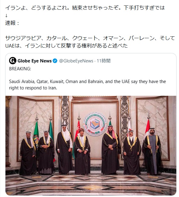 サウジアラビア、カタール、クウェート、オマーン、バーレーン、そしてUAEは、イランに対して反撃する権利があると述べた