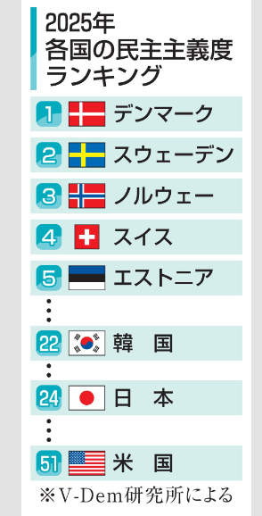 スウェーデンの調査機関「V―Dem研究所」は17日、世界各国の民主主義の度合いを独自指標で示した報告書を発表した。2025年の米国について、民主主義がトランプ政権下で現代では前例がない速さで壊れ、過去50年間で初めて「自由民主主義国家の地位を失った」と評価した。
