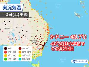 オーストラリア南東部では7日(水)頃から熱波に見舞われています。10日(土)はシドニー周辺で気温が上昇し、今年初めて40℃を超えました。