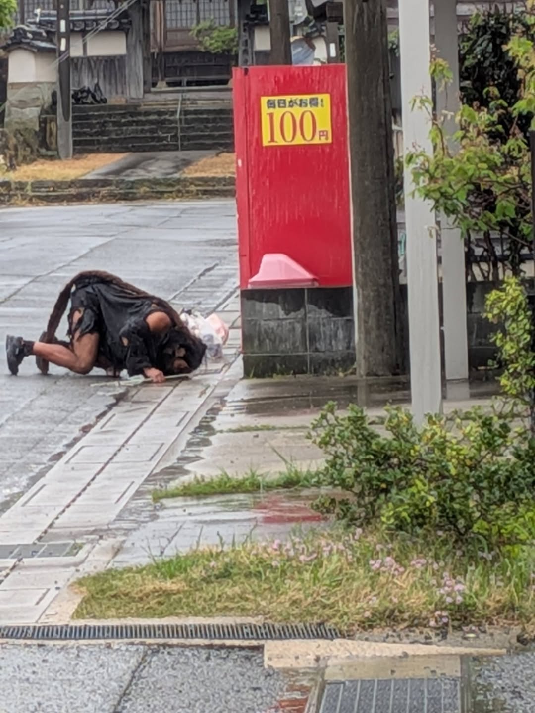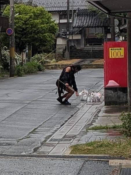 娘が工房へ飛び込んできて 「有名人がやってきたー‼️ っと😳 原始人 原始人 ???🤔 外に出るとまさに原始人みたいな人が😳 娘に聞くとあの格好で日本を歩いて放浪しているとか… 雨降る中何やら自販機の下や溝をつついて何かを探しているような… まぁ自由やし勝手やけど その格好、まだ寒いで🥶