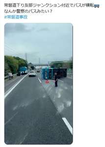 常磐道下り友部ジャンクション付近でバスが横転🚌