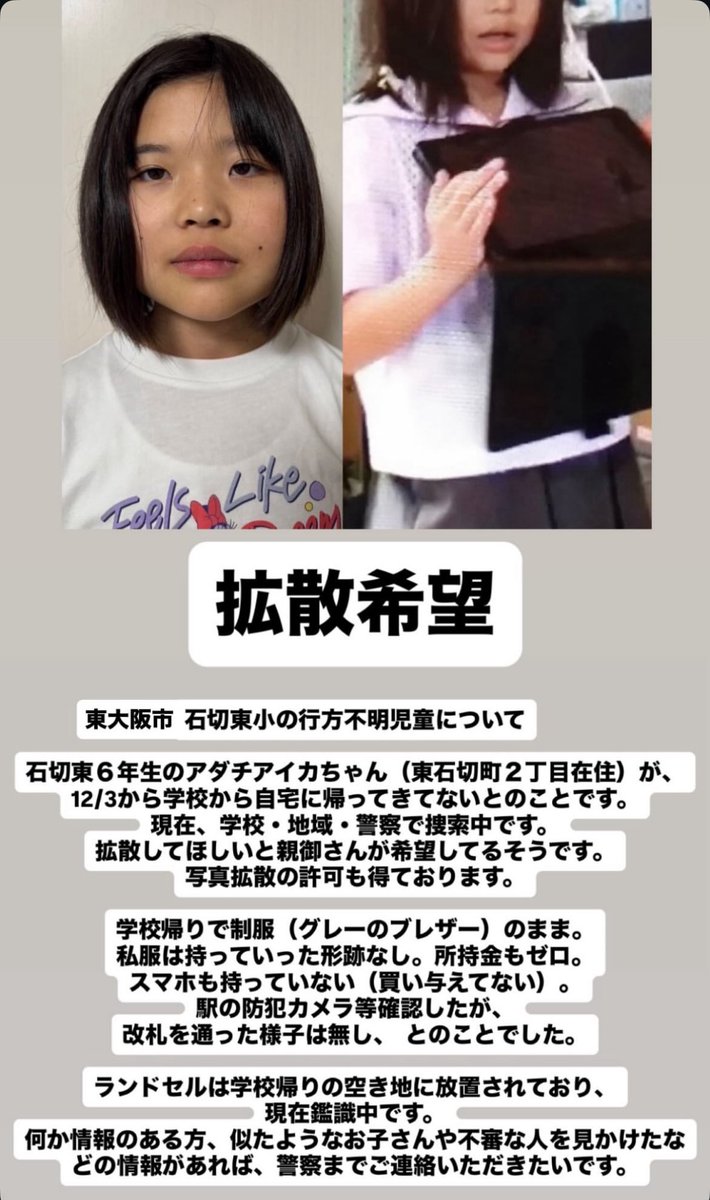 小6女児・安達愛佳さん行方不明、12月3日から捜索続く