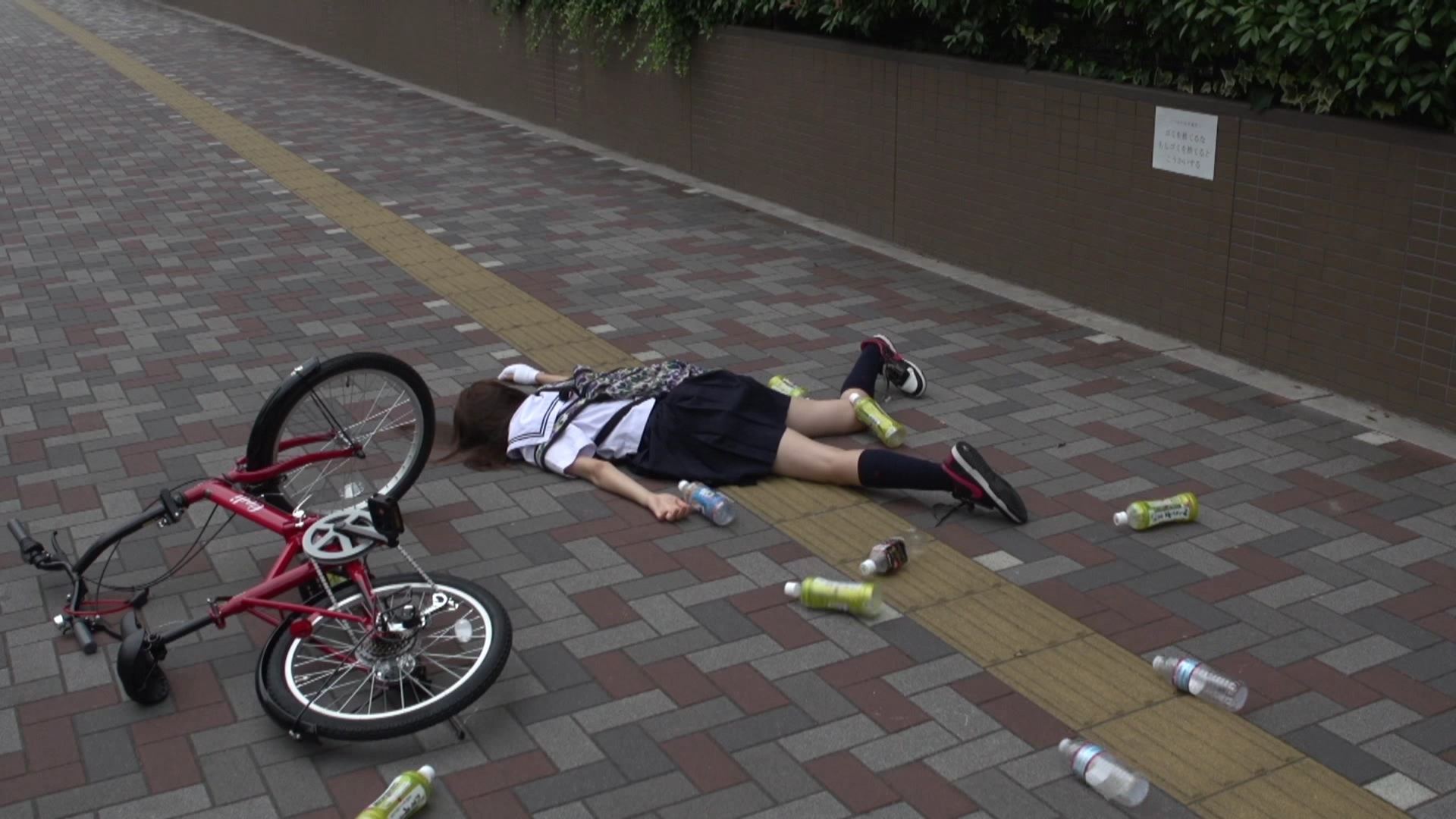 自転車の倒れた方向と女の子の位置が一致していない