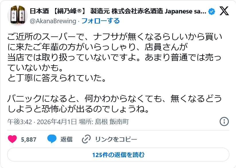 年寄りはオイルショックの時のやるせなさが買い急ぎという行為を起こさせるんですよ