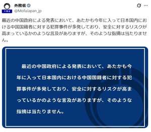 中国外務省は26日「日本で中国人を狙った犯罪事件が多発している」と述べ日本側に中国人の安全を確保するよう求めました。