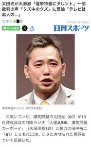 太田は番組内で自身に寄せられた悪評について1時間以上にわたり反論。元TBSプロデューサーの実名を挙げた上で、当該人物が太田出演のTBS系衆院選特番をめぐって批判していることを明かした。太田は当該人物の発言を再現し「私、開票特番のプロデューサーやってました。やってましたけど、TBSがズルいのは、とにかくこれを太田に言わせたことですね」「局アナじゃなくて、太田にやらせたことです。だってこいつTBSじゃないでしょ」「漫才師でしょ? 言う方も言う方だけど、言わせる方も言わせる方ですよ」などと語ってみせた。
