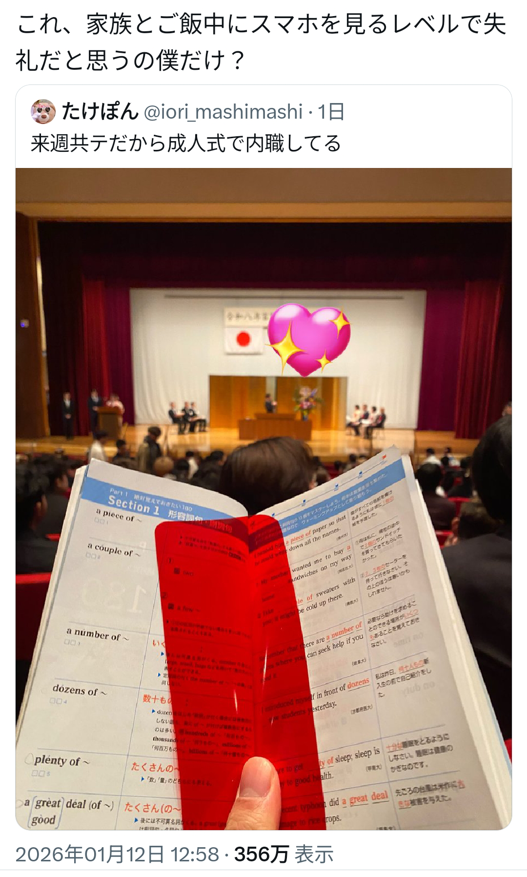 わざわざ単語帳を持ち込み、わざわざスマホを構えて撮ってる姿を想像すると、悲しみの念を禁じ得ない