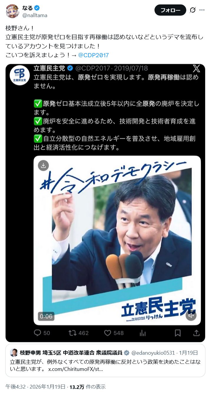 立憲民主党の枝野幸男最高顧問が2026年1月20日にXで、原発再稼働に対する党の姿勢について、過去に「ミスリードする広報物」があったとして、「深くお詫び申し上げます」と謝罪した。