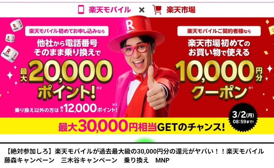 【絶対参加しろ】楽天モバイルが過去最大級の30,000円分の還元がヤバい!!楽天モバイル 藤森キャンペーン