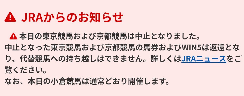本日2/8(日)の東京競馬と京都競馬は雪のため開催中止。WIN5も発売取り止め。小倉競馬のみ通常通り開催。