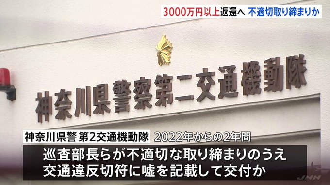 神奈川県警第2交通機動隊の不適切取り締まり問題 返還する反則金は3000万円以上か 当該の巡査部長らは近く書類送検の方針