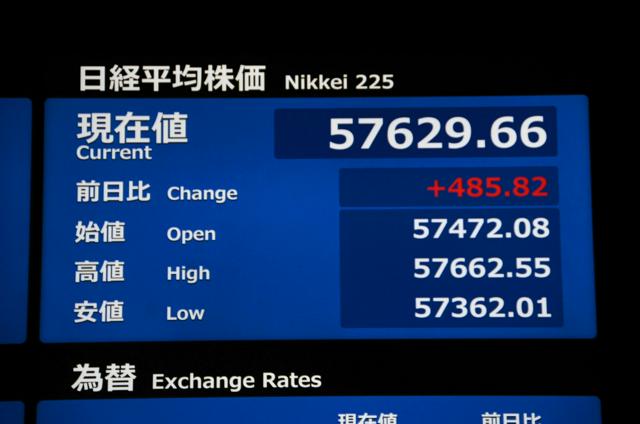 19日の東京株式市場で日経平均株価は続伸し、一時、前日の終値より500円超高い5万7660円台をつけた。10日に記録した終値の史上最高値 (5万7650円54銭) を上回った。米国市場でハイテク株が買われて主要な株価指数が上昇した流れを引き継いだほか、円安ドル高の進行も株価を支えている。
