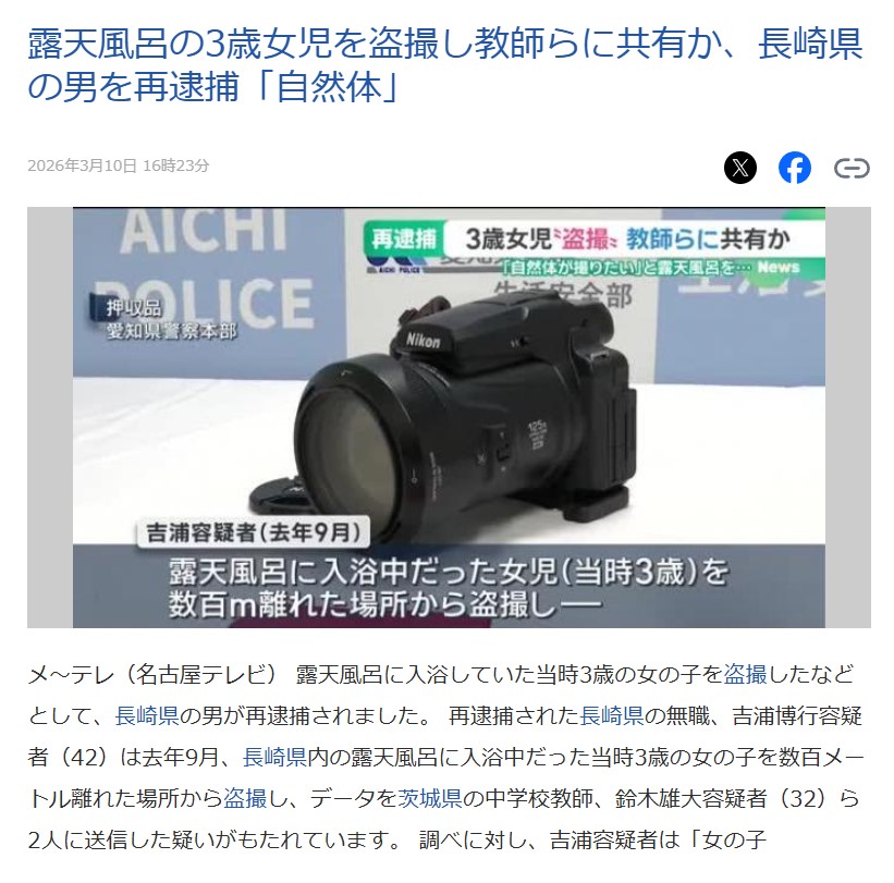 露天風呂の3歳女児を盗撮し教師らに共有か 長崎県の男を再逮捕「自然体のものが撮りたいと思い…」