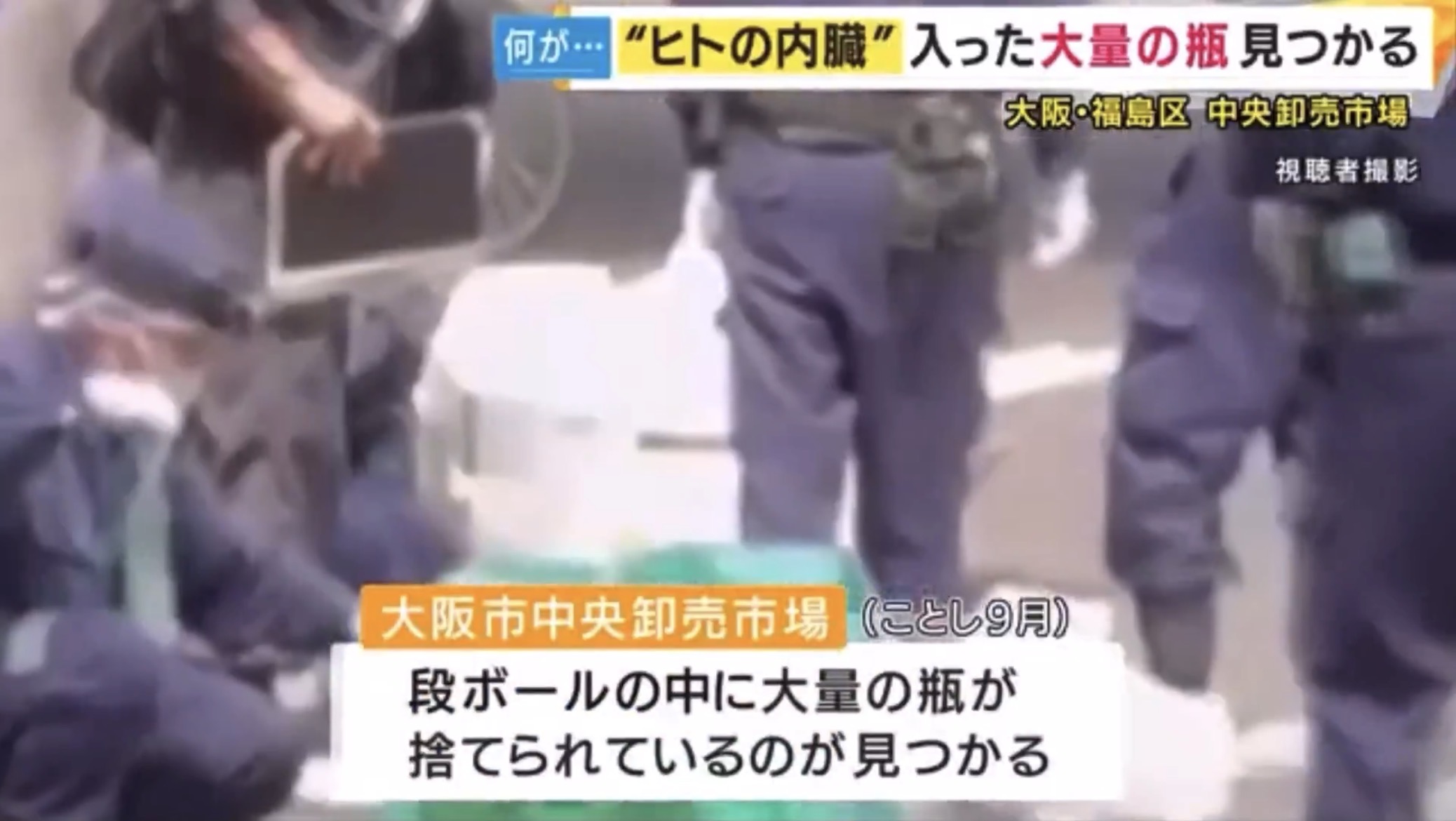 大阪市中央卸売市場のゴミ捨て場に人の内臓が入った名前入りの瓶が大量に捨てられていた事件。