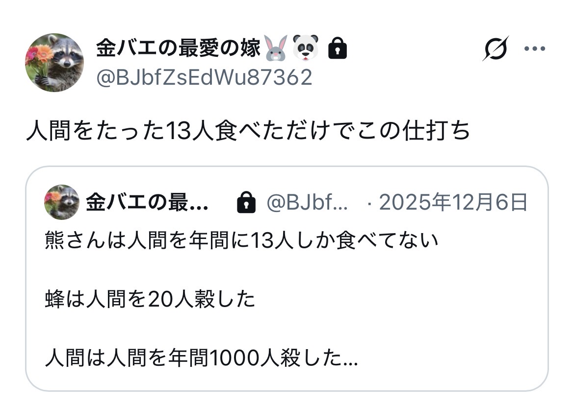 はっきりしないものや行方不明になったのを含めたら毎年数十人は熊に喰い殺されて続けている