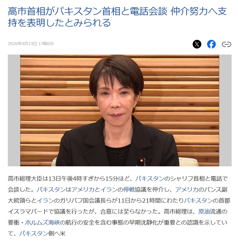 【速報】高市総理がパキスタン首相と電話会談 アメリカとイランの停戦協議を仲介