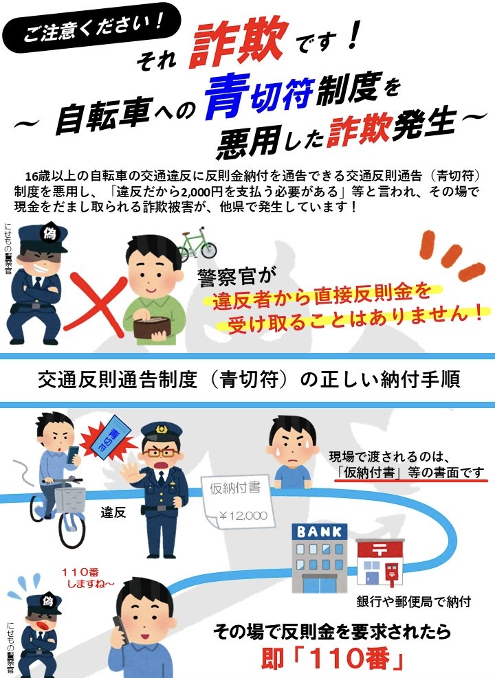署によると、男性は12日朝、小山市内の横断歩道を自転車で通行した際、署員を名乗る私服姿の男2人から「信号無視の違反で罰金1万5千円ね」「今払わないと捕まる」などと言われ、現金を手渡した。偽の青切符を受け取ったが不審に思い、付近でパトカーに乗車していた警察官を見つけて相談、発覚した。