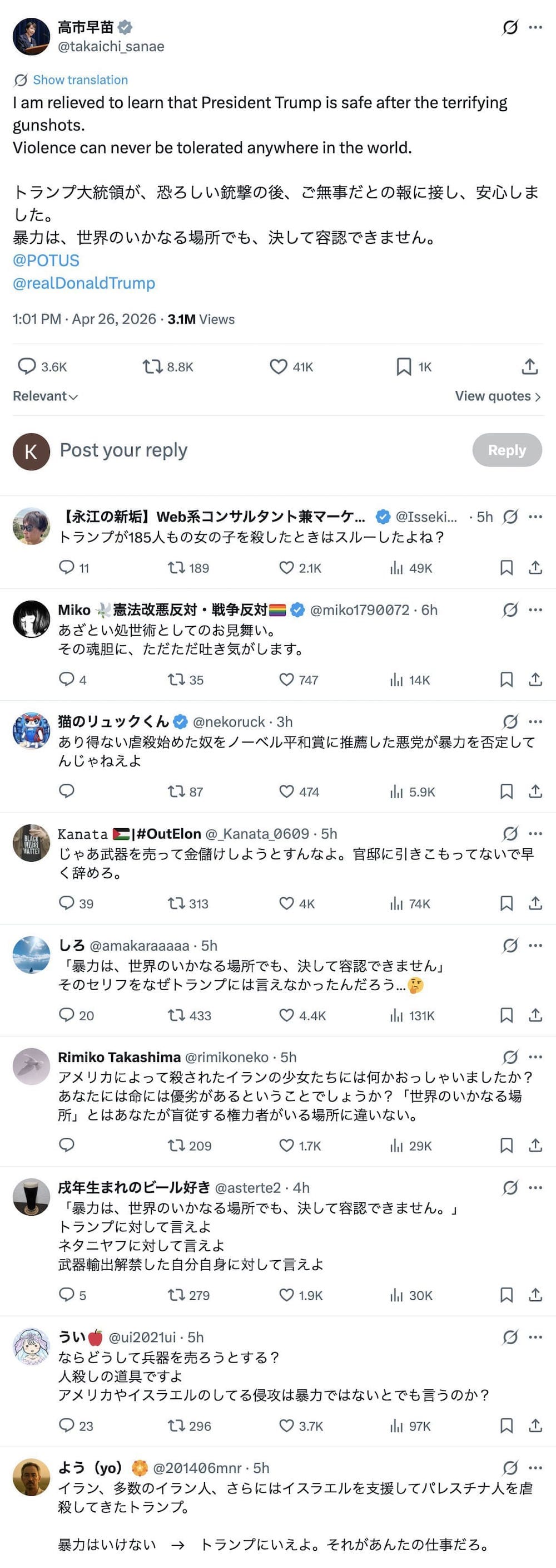 トランプの忠犬サナ公、こびへつらいがヒドすぎてSNSのコメ欄が大荒れ中