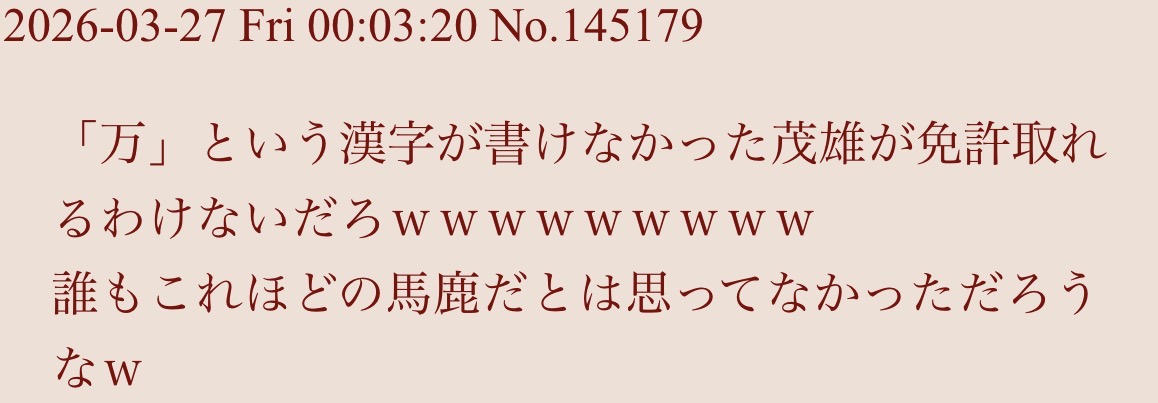 「万」という漢字が書けなかった茂雄が免許取れるわけないだろwwwwwwwww